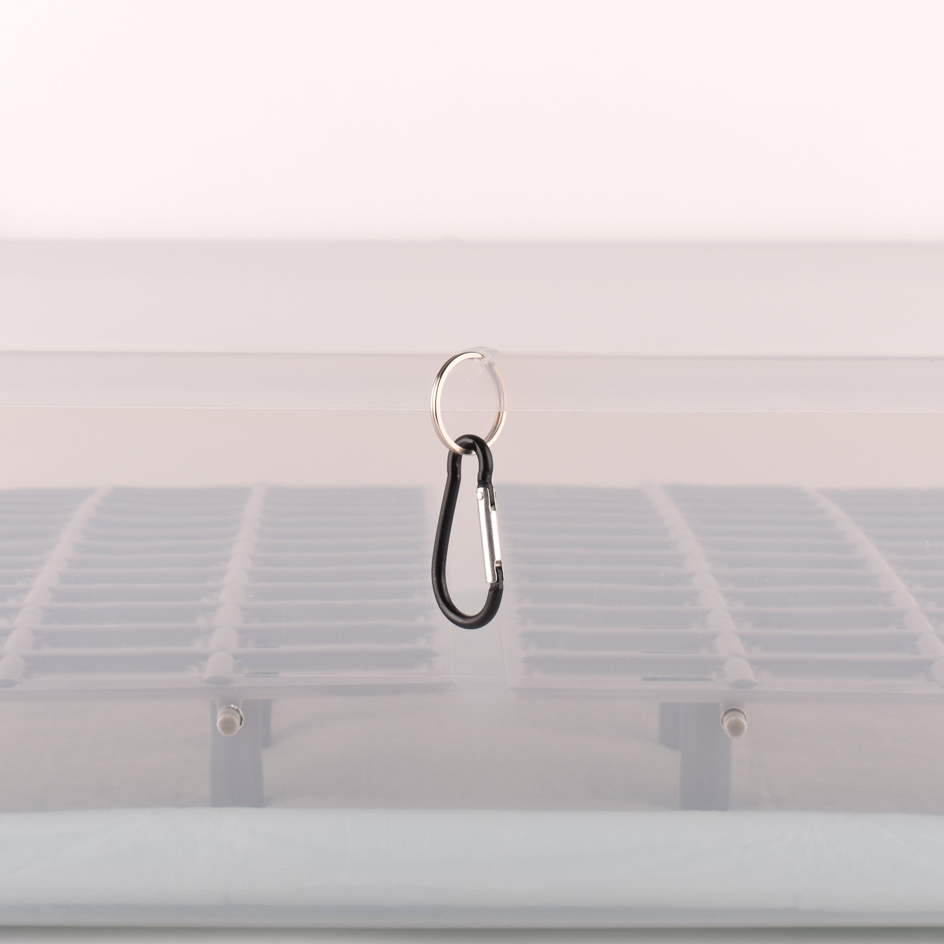A carabiner clip is attached to the back of the LitterBuns Bin so it can be secured to a pen set up. This is helpful when you have large buns jumping in and out or for buns that like to rearrange their furniture.