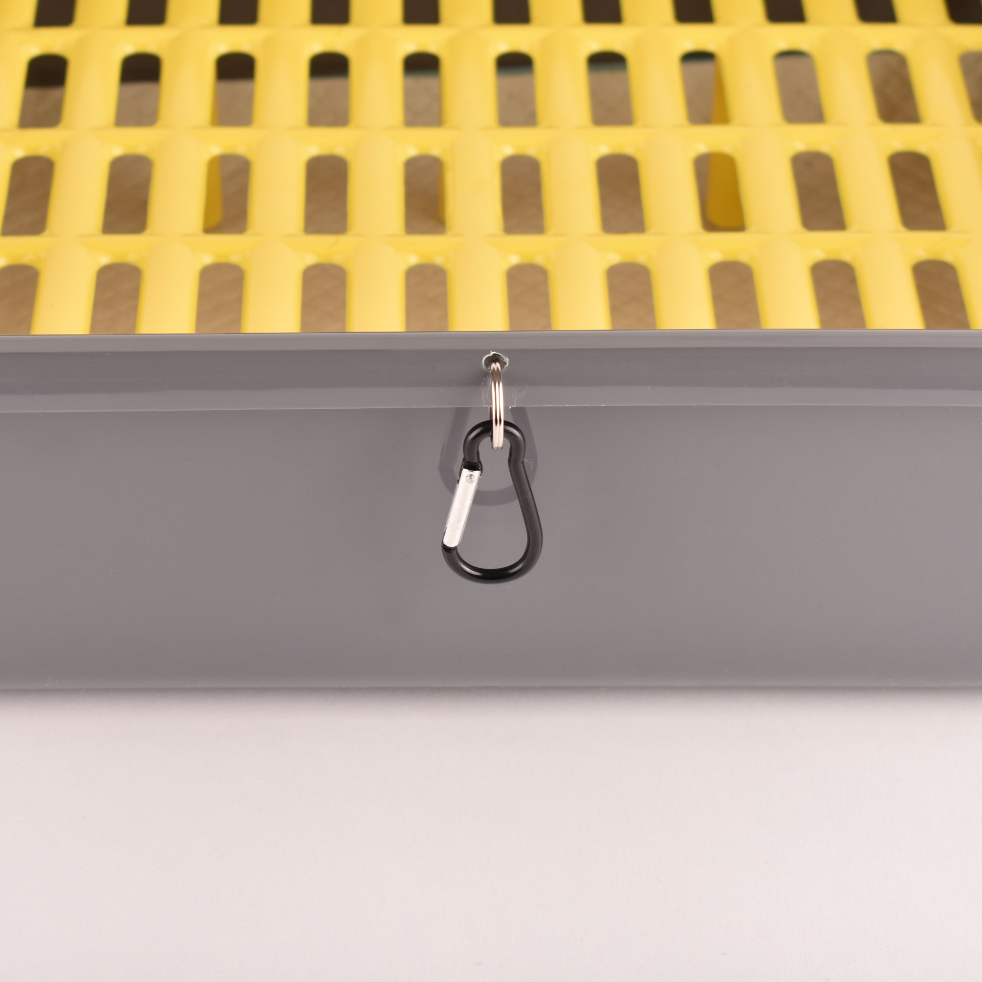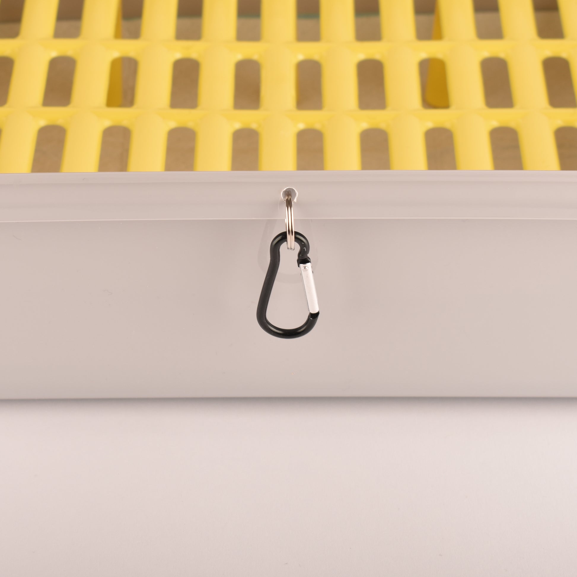 A custom carabiner clip is attached to the back of the LB MINI-1 so it can be secured to a pen set up. This is helpful for buns that like to rearrange their furniture and will prevent them from tossing and even flipping their litter box.
